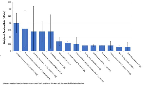 - Hyperthermia is rapidly life-threatening in sympathomimetic poisoning.25 External and immersive cooling has been used to treat hyperthermia in adults and a 17-year-old patient with sympathomimetic poisoning.5,27,28 Evaporative or immersive cooling modalities reduce temperature more rapidly in adults than cooling blankets, the application of cold packs, or endovascular cooling devices.29-33 Ice water immersion resulted in the fastest cooling rates in adults and critically may cool faster than 0.15 °C/min (0.27 °F/min), which has been associated with increased survival.34,35 High-quality data on cooling measures for hyperthermic sympathomimetic patients are lacking, but immersion seems effective.28 Limited pediatric data on the rapid external cooling for life-threatening sympathomimetic poisoning were identified, thus, the recommendation for children is extrapolated primarily from the adult data (refer to the Hyperthermia section).