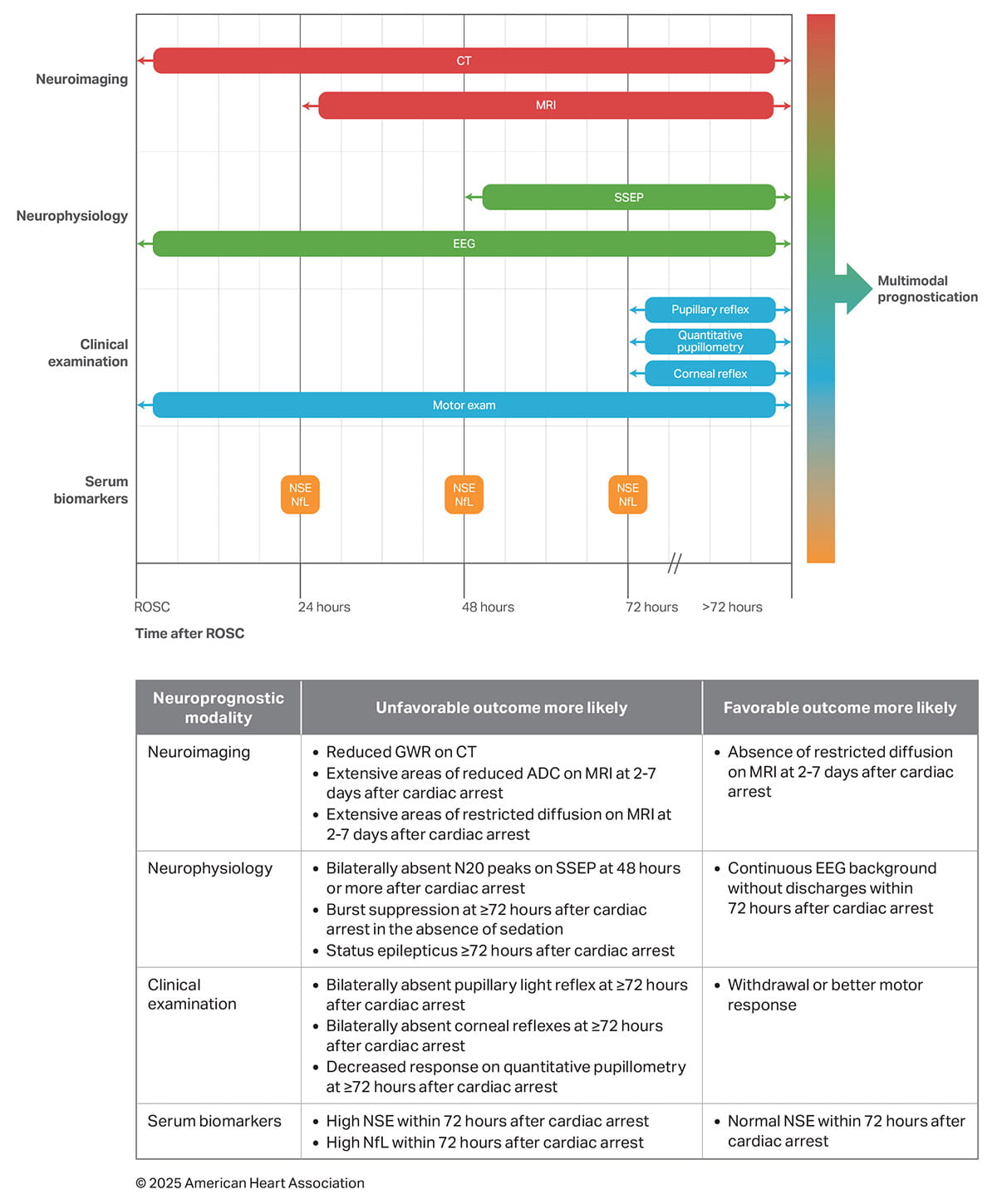 - The section on neuroprognostication was updated to include predictors of favorable outcome, and neurofilament light chain (NfL) was added as a serum biomarker: “When performed in combination with other prognostic tests, it may be reasonable to consider high serum values of neuron-specific enolase (NSE) or NfL within 72 hours after cardiac arrest to support the prognosis of unfavorable neurological outcome in patients who remain comatose.”
